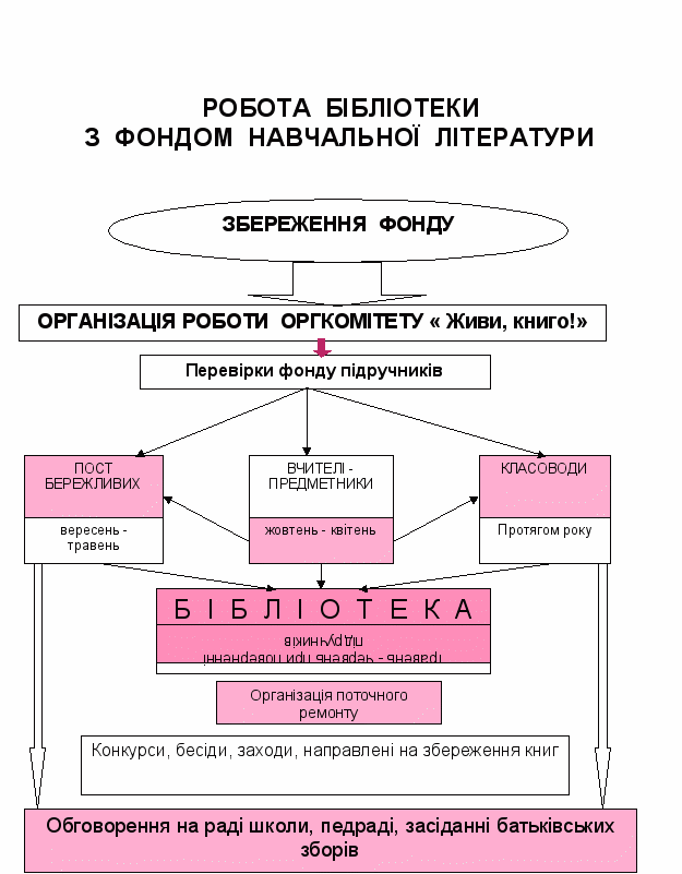 1.2. Передбачає заходи з вдосконалення роботи по збереженню підручників при плануванні навчально-виховного процесу на наступний навчальний рік і забезпечує контроль за їх виконанням.