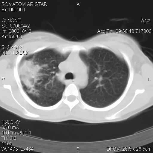 Установлен клинический диагноз: инфильтративный туберкулез S2 правого легкого в фазе распада и обсеменения, МВТ положительно, осложненный кровохарканием. Лекарственная устойчивость к рифампицину, изониазиду, пиразинамиду, ципрофлоксацину, стрептомицину.