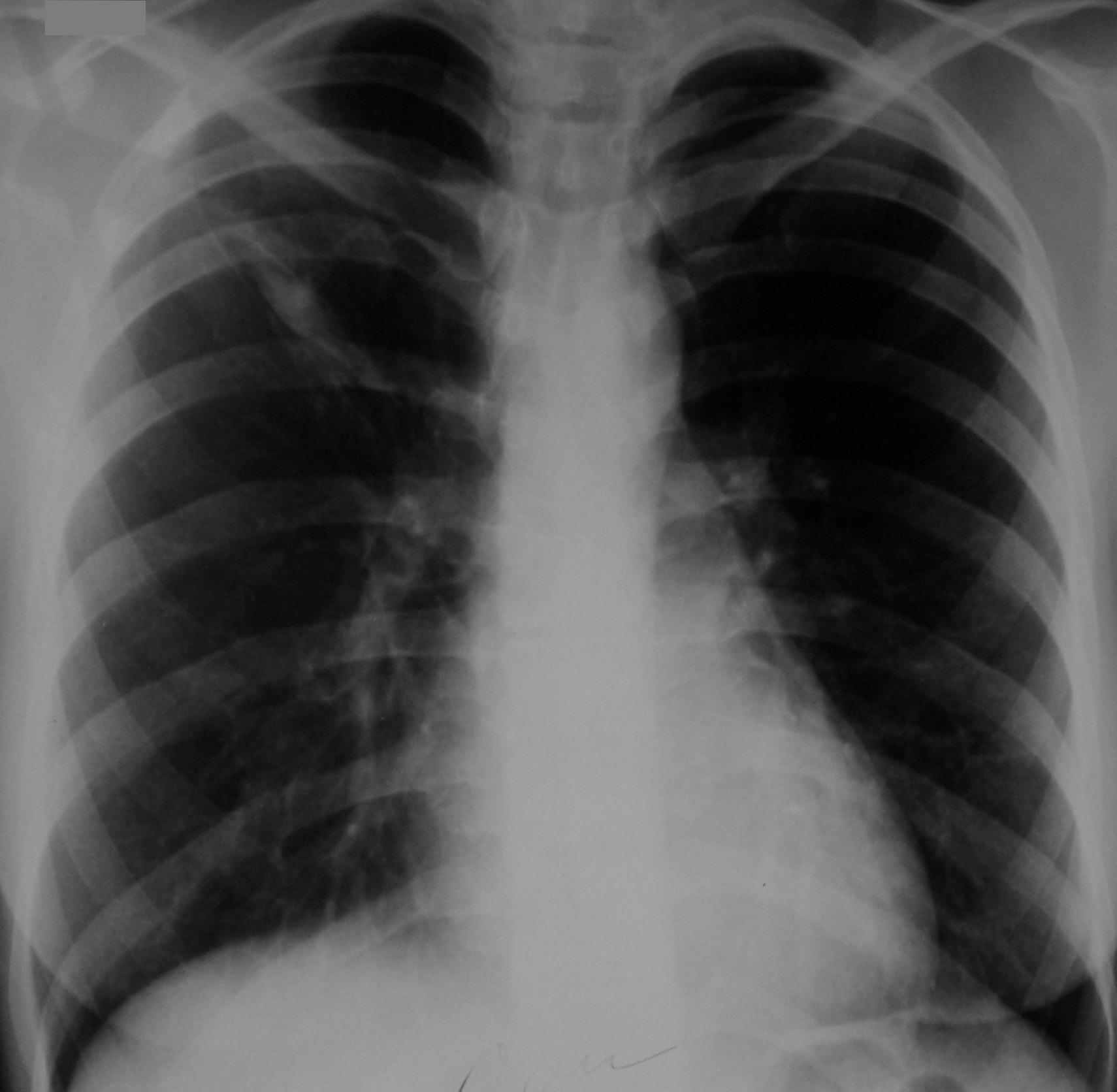 При поступлении состояние средней степени тяжести. Температура тела 38,5ºС. Пульс 86 ударов в минуту. Артериальное давление 100/70 мм. рт. столба. Частота дыхательных движений 22 в мин. Дыхание справа жесткое, ослаблено в верхних отделах, слева – везикулярное. Анализ крови от 23.12.2004: гемоглобин – 134 г/л, эритроциты – 4,0×1012/л, лейкоциты – 9,0×109/л, эозинофилы – 4, палочкоядерные – 3, сегментоядерные – 68, лимфоциты – 21, моноциты – 4, СОЭ – 20 мм. в час. Время свертывания 4 мин. Длительность кровотечения 2 мин. Общий анализ мочи от 23.12.2004 г.: цвет соломенно-желтый, прозрачная, плотность 1020 г/л, белок отрицательно, лейкоциты 3-4 в поле зрения, эпителий плоский до 4 в поле зрения. Анализ мокроты на МБТ от 23.12.2004 г. люминесцентным и от 24.12.2004 г. бактериоскопическим методами – положительно. Посев мокроты на МБТ от 27.09.2004 г.: рост до 10 колоний, устойчивость к рифампицину, изониазиду, этамбутолу, ципрофлоксацину, стрептомицину. Электрокардиограмма от 23.12.2004 г.: синусовый ритм 108 в мин. Отклонение электрической оси вправо. Нарушение внутрижелудочковой проводимости. Гипертрофия правого желудочка. Спирография от 30.12.2004 г.: нарушение функции внешнего дыхания по смешанному типу за счет всех групп бронхов. При рентгенографии органов грудной клетки от 23.12.2004 г. выявлена отрицательная динамика: справа в S2 округлый инфильтрат 3 см. в диаметре с центральным распадом. Вокруг появились крупные мягкие очаги. Левое легкое без очаговых и инфильтративных изменений (рис. 4).