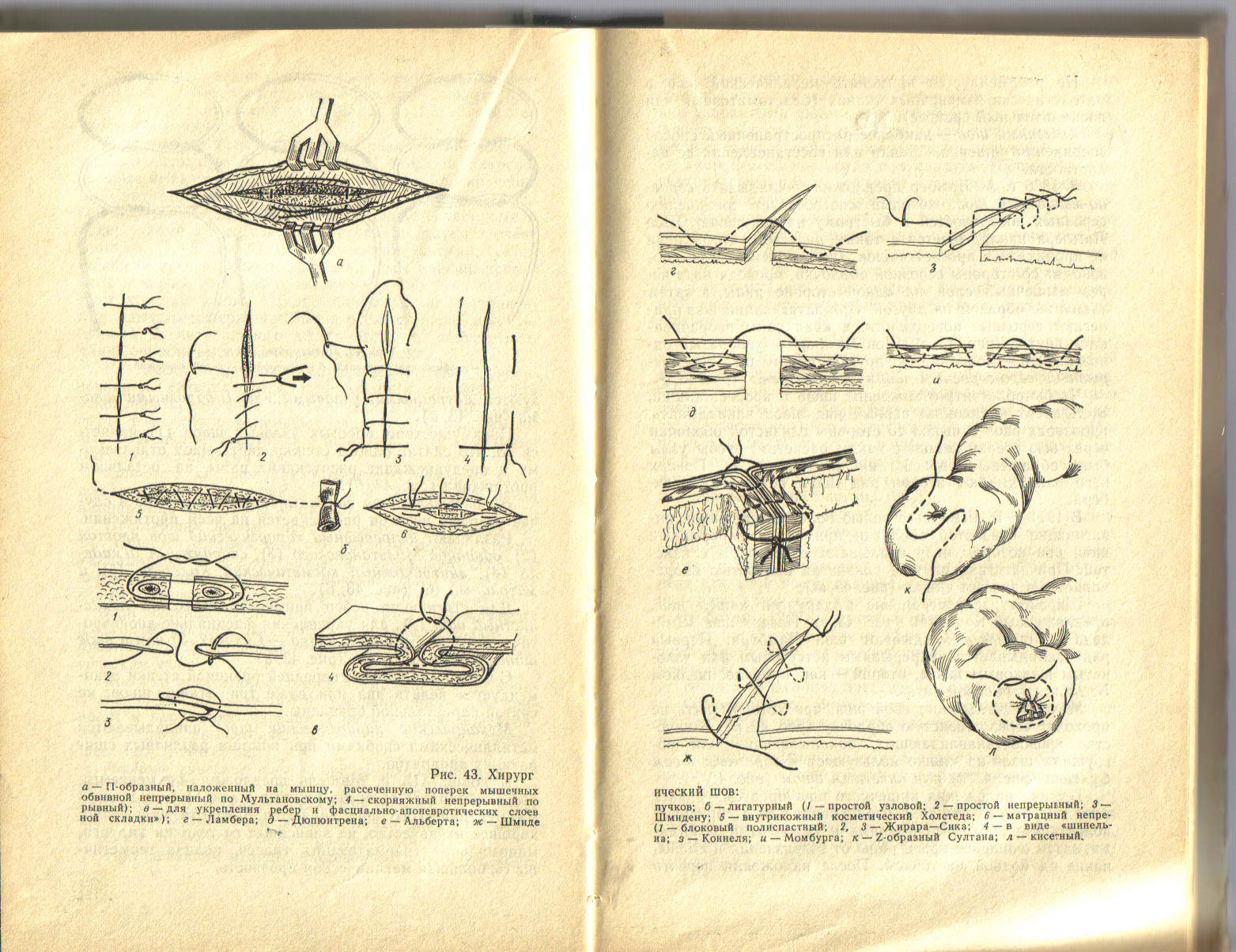 Выход из операции должен осуществляться послойно. Первый ряд швов накладывают на брюшину. Так как ее легко проколоть, для прокола брюшины используются только колющие иглы. При ушивании брюшины желательно использовать рассасывающийся шовный материал, так как края брюшины достаточно быстро склеиваются между собой. Использование на брюшину непрерывного шва (простого непрерывного или шва Мультановского) позволяет сэкономить время и шовный материал. Затем ушивают элементы среднего слоя с подхватом внутрибрюшной фасции и предбрюшинной клетчатки. Если требуется ушить мышцы, то иглу рационально использовать колющую, пинцет – анатомический или лапчатый, шовный материал – рассасывающийся. При этом можно использовать непрерывный шов. Если в качестве элемента среднего слоя ушивают белую линию живота, то более целесообразно использовать нерассасывающийся материал (из-за относительно длительного процесса заживления) и П-образные швы, позволяющие укрепить это слабое место. После этого накладывают шов на элементы поверхностного слоя: кожу, подкожную клетчатку и поверхностную фасции. Иглу при этом используют режущую (способную преодолевать значительное сопротивление тканей), пинцет – хирургический или лапчатый. В качестве кожного шва обычно используют простой узловой шов, в качестве шовного материала при этом часто используют достаточно толстый шелк. Если подкожная клетчатка в месте наложения шва достаточно толстая, то ее целесообразно ушить отдельно (с захватом поверхностной фасции), а на кожу наложить внутрикожный шов. Кроме того, на переднебоковой стенке живота можно использовать шов Донати.