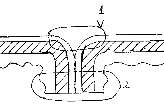 Рис. 4. Схема двухрядного шва Альберта, где 1 – завязанный стежок шва Ламбера, 2 – сквозной шов.