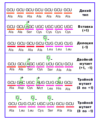нутри гена каждый нуклеотид входит в состав значащего кодона. В 1961г. Сеймур Бензер и Френсис Крик экспериментально доказали триплетность кода и его компактость. Суть эксперимента: "+" мутация - вставка одного нуклеотида. "-" мутация - выпадение одного нуклеотида. Одиночная "+" или "-" мутация в начале гена портит весь ген. Двойная "+" или "-" мутация тоже портит весь ген. Тройная "+" или "-" мутация в начале гена портит лишь его часть. Четверная "+" или "-" мутация опять портит весь ген. Эксперимент доказывает, что код триплетен и внутри гена нет знаков препинания. Эксперимент был проведен на двух рядом расположенных фаговых генах и показал, кроме того, наличие знаков препинания между генами.