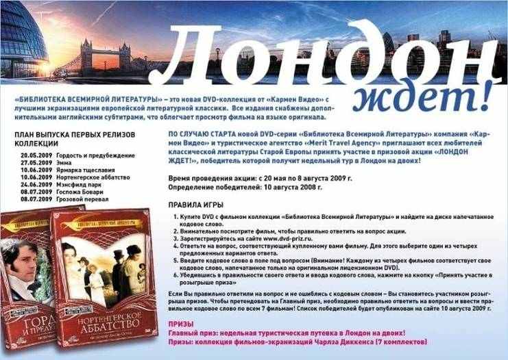 о случаю старта новой DVD-серии «Библиотека Всемирной Литературы» компания "Кармен Видео" и туристическое агентство «Merit Travel Agency» приглашают всех любителей классической литературы Старой Европы принять участие в призовой акции "ЛОНДОН ЖДЕТ!", победитель которой получит недельный тур в Лондон на двоих!Время проведения акции: с 20 мая по 08 августа 2009 г.