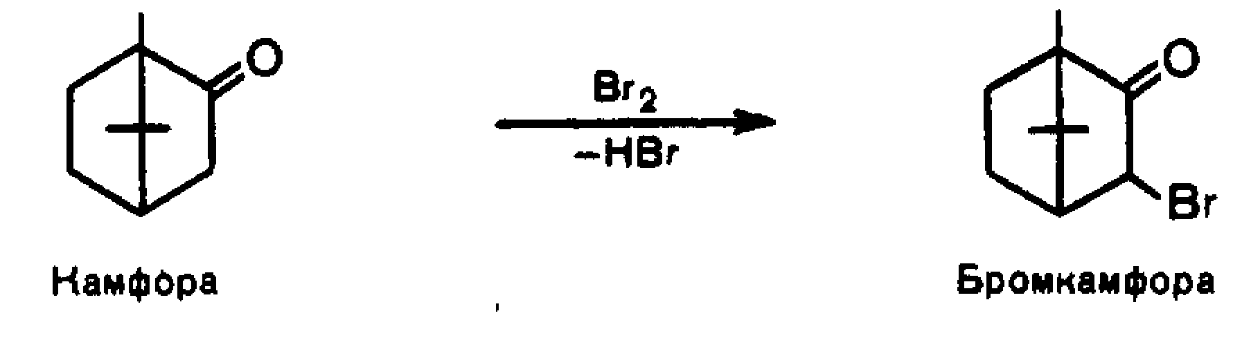 Камфора издавна применяется в медицине как стимулятор сердечной деятельности. Она способна вступать во взаимодействие с бромом по α-положению относительно карбонильного атома углерода. При этом образуется бромкамфора, которая улучшает деятельность сердца и оказывает успокаивающее действие на ЦНС.