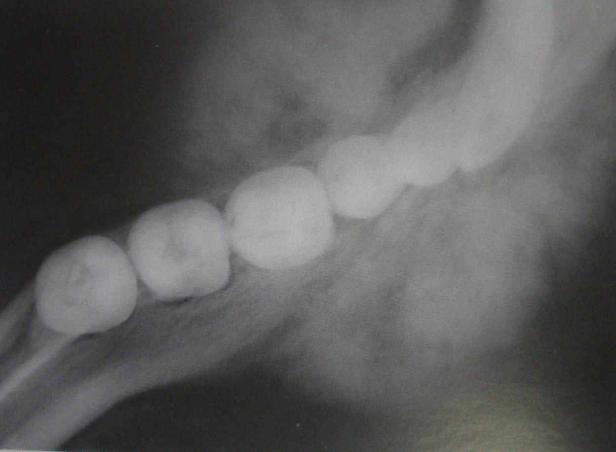 Больной Н., 25 лет, обратился с жалобами на деформацию альвеолярного отростка верхней челюсти справа. При осмотре полости рта обнаружена деформация альвеолярного отростка за счет вздутия с вестибулярной стороны в области 1.2, 1.3, 1.4 пальпация которой безболезненная. В области наибольшего выбухания определяется симптом "пергаментного хруста". Больной отмечает, что в настоящее время практически здоров. Два месяца назад у него был перелом нижней челюсти справа.