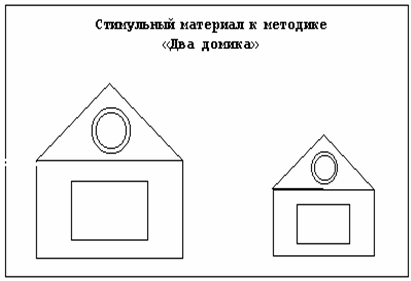 ^ Стимульный материал: На листе бумаги рисуют два домика. Один из них побольше – красного цвета, другой поменьше – черного цвета. Как правило, этот рисунок не заготавливают заранее, а делают на глазах у ребенка черным и красным карандашами.