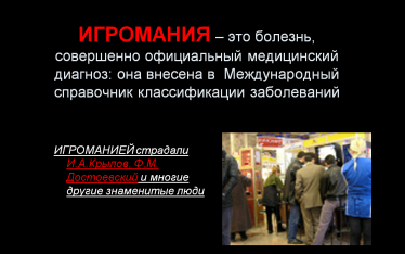 Игромания – по мнению медиков – серьезное расстройство личности и поведения, которое заключается в частых повторных эпизодах участия в азартных играх, доминирующих в жизни субъекта, и ведущих к снижению социальных, профессиональных, материальных и семейных ценностей.