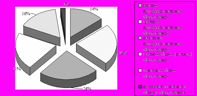 на 1394 человек или на 16% по сравнению с соответствующей датой преды-дущего года. Из них имеют: высшее профессиональное образование – 988 человек; среднее профессиональное образование – 1674 человека; начальное профессиональное образование – 1738 человек; среднее (полное) общее образование – 1570 человек; основное общее образование – 1207 человек;