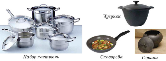 Для приготовления пищи существуют разные виды кухонной посуды: кастрюли, сковородки, чугунки и т.п. (рис. 141).