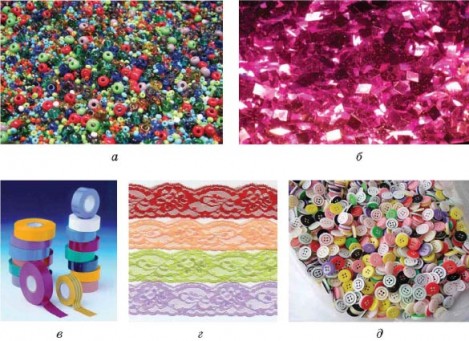 Для украшения аппликации используют (рис. 76): бисер (а), блёстки (б), цветные ленты (в), кружево (г), пуговицы (д) и т.п.