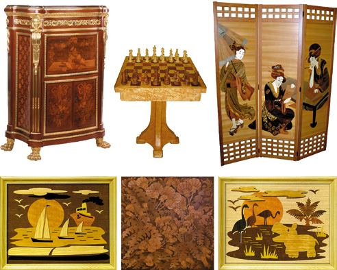 | Рис. 27. Использование шпона из ценных пород древесины: сверху – отделка ценных изделий; снизу – изготовление сувениров |