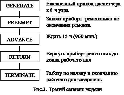 3.1. Таблица 3.1 Операторы GPSS Назначение Транзакты: 1-вый сегмент ЭВМ, предназначенная для планового профилактического осмотра 2-рой сегмент ЭВМ-сервер, нуждающаяся во внеплановом ремонте 3-тий сегмент Диспетчер, открывающий в 8 ч тра ВЦ изакрывающий его через 8 ч 4-тый сегмент Наблюдатель, следящий за содержимым очереди для оценки