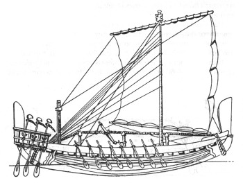 Рабы гребли спиной по направлению движения судна. Наибыстрейший темп гребли составлял 26 тактов в минуту, что обеспечивало кораблю скорость, равную 12 км/ч. Управляли средством передвижения по воде при помощи весел, установленных на корме.