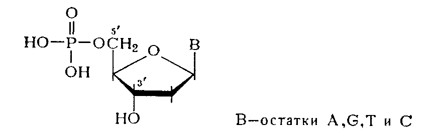 Из данных гидролиза ДНК фосфодиэстеразами различной специфичности становится очевидным, что связь нуклеозидных остатков в ДНК осуществляется фосфатной группой, которая одновременно этерифицирует гидроксильную группу у вторичного атома углерода (положение 3') одного нуклеозидного звена и гидроксильную группу у первичного атома углерода (положение 5') - другого нуклеотидного звена.