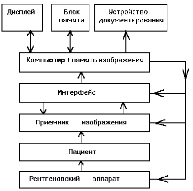 На рис.1 приведена схема типичной цифровой рентгенографической системы. Рентгеновская трубка и приемник изображения сопряжены с компьютером и управляются им, а получаемое изображение запоминается, обрабатывается (в цифровой форме) и отображается на телеэкране, составляющем часть пульта управления (или устройства вывода данных) оператора-рентгенолога.