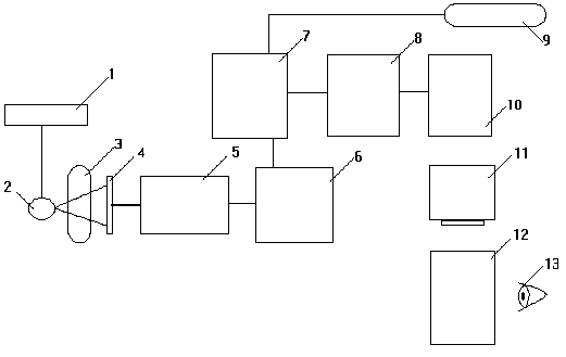 1-генератор; 2-рентгеновская трубка; 3-пациент; 4-ЭОП; 5-видеокамера; 6-аналого-цифровой преобразователь; 7-накопитель изображений; 8-видеопроцессор; 9-сеть; 10-цифро-аналоговый преобразователь; 11-монитор; 12-снимок; 13-рентгенолог.