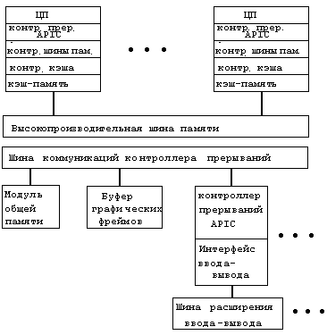 1. ЦП 2. Контроллер прерываний APIC 3. Контроллер шины памяти 4. Контроллеры кэша 5. Кэш-память 6. Высокопроизводительная шина 7. Шины коммуникаций контроллера прерываний 8. Модуль общей памяти 9. Буфер графических фреймов 10. Контроллер прерываний APIC 11. Интерфейс ввода-вывода 12. Шина расширения ввода-вывода памяти