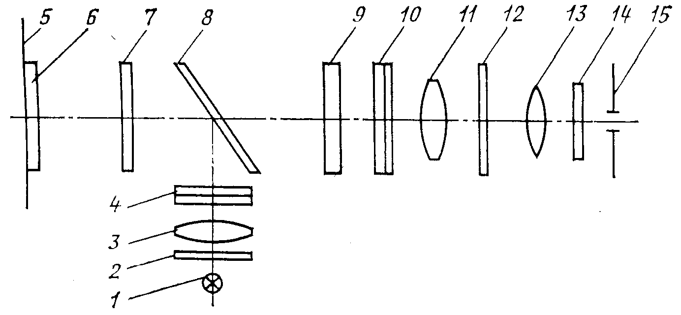 Источник света 1 (лампа СЦ-61) размещен в фокусе объектива 3. Защитные стекла 2, 7 и 12 предохраняют прибор от попадания в него загрязнений. Параллельный пучок лучей проходит поляризационный светофильтр (поляризатор 4), полупрозрачное зеркало 8 и, отразившись от светоделительного слоя, падает на оптически чувствительное покрытие 6, нанесенное на исследуемый объект 5. После отражения от покрытия свет попадает в анализаторный узел прибора, проходит компенсатор 9, анализатор 10 (аналогичный поляризатору 4) и попадает в зрительную трубу (сменное увеличение 2 и 10 ´ ) со шкалой в совмещенной фокальной плоскости объектива 11 и окуляра 13. Перед глазной линзой окуляра и выходным зрачком 15 устанавливается светофильтр 14. Такая оптическая схема получила наименование Т-образной схемы.