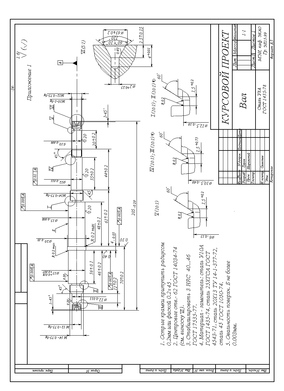 Пример выполнения чертежей деталей приведены в приложении 1(вал) и приложение 2 (корпус токоподвода).