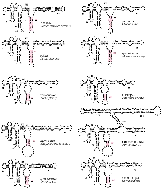 Модели вторичной структуры 18S рРНК в области спиралей 42 и 44 различных эвкариот. Последовательности нуклеотидов взяты из банка данных GenBank.