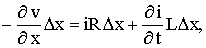 где R и L – сопротивление и коэффициент индуктивности, рассчитанные на единицу длины провода. Знак минус взят потому, что ток течет в направлении, обратном возрастанию v. Сокращая на