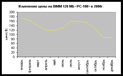 Падение цен на модули оперативной памяти, начавшееся в середине 1999г. продолжилось и в первые месяцы 2000г (кривые на графике убывают с января по апрель) . Затем наступает стабилизация (апрель – май) . Это связано с предстоящим традиционным летним подорожанием (июнь – август) . После цены опять начинают планомерно снижаться в свете общего понижения стоимости компьютерных комплектующих (август – ноябрь) , цены падают низко как никогда (до $21 за DIMM 32 MB) . Затем опять идет скачок верх (ноябрь – декабрь) , и в перспективе цены, на мой взгляд, будут продолжать расти.