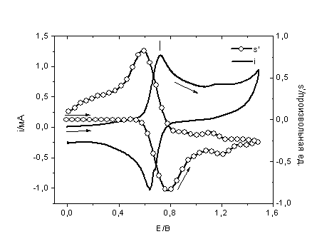 электрона. Судя по кривой ЦВА, можно заключить, что первый пик окисления является обратимым, а вот обратимость второгоа не проявляется на вольтамперограмме в данных условиях эксперимента. Первому пику окисления i(E) соответствует пик sТ(E), фиксирующий образование катион-радикала.