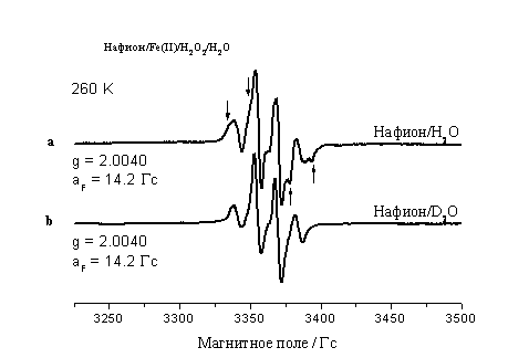 аа Парамагнитные ионы Fe3+ попадают в гидрофильную часть мембраны путем частичной нейтрализацииа протонов группы -SO3H непосредственно трехвалентными ионами железа, либо получаются по реакции Фентона из ионов Fe2+, которыми также частично нейтрализованыа группы -SO3H, во время обработки раствором перекиси водорода: